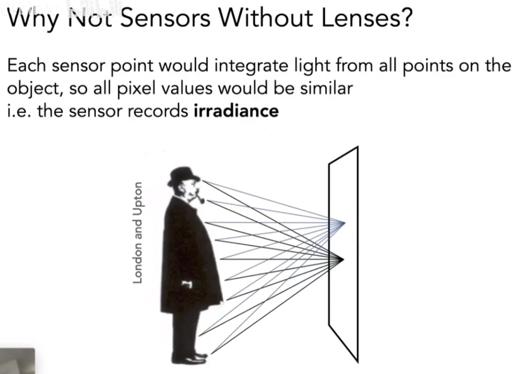 对于传感器而言,任何一个点记录的都是一个irradiance。如果没有小孔或者透镜,那么任意一个点都能接受来自四面八方的光,看到的就是糊的。