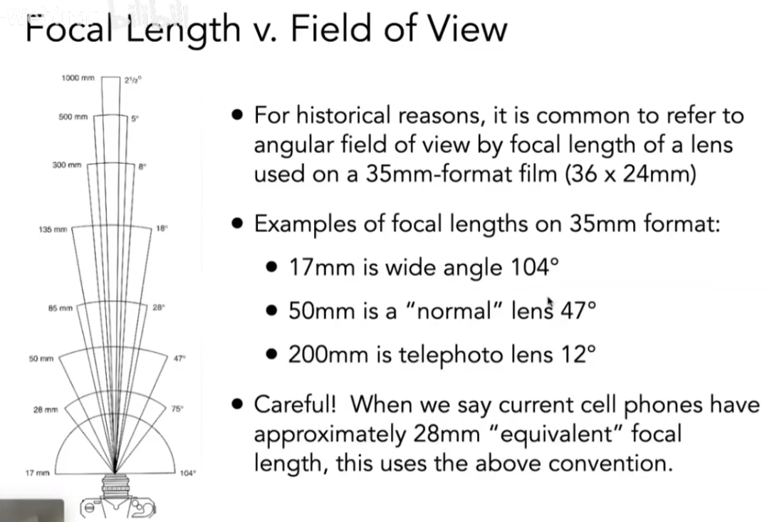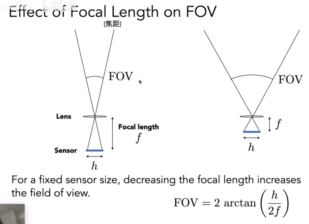 视场的意思就是能看到多大的范围。以针孔摄像机为例,我们传感器的长h(一般称为高度),传感器到针孔的距离为焦距f。利用相似三角形的原理,就可以得到视场的范围。也可以发现,相同h,f越小,视场范围越大。