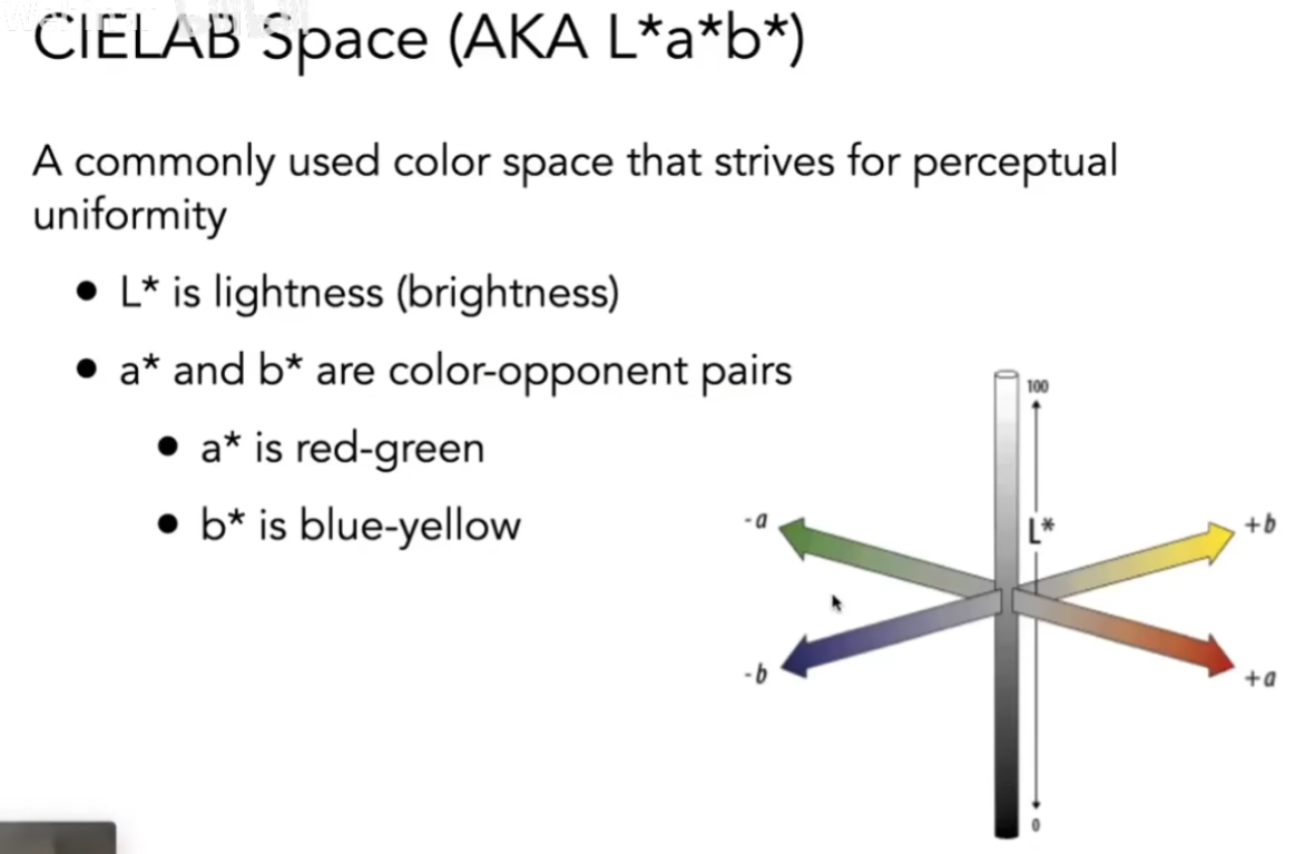 CIELAB有三个轴,任何一个轴的极限两端都是互补色。
