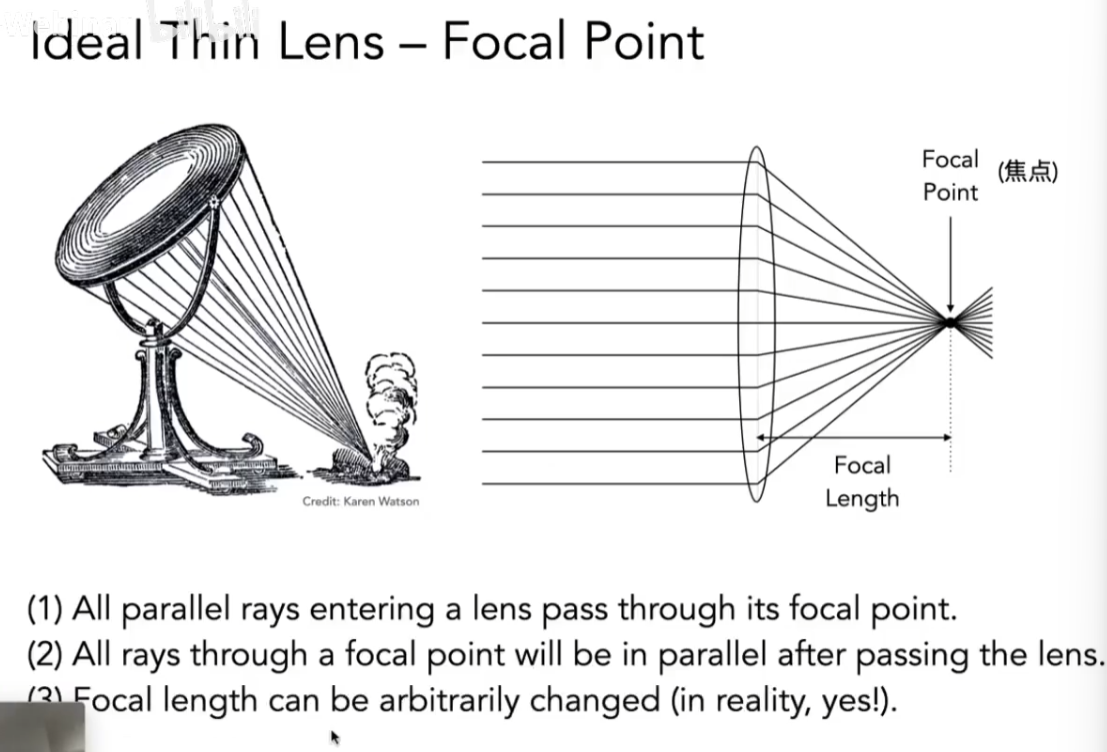 对于理想的透镜,平行光穿过透镜,一定会被反射到一个点上去,这个点就是焦点,焦点到透镜的距离称为焦距。我们知道,光线具有可逆性,因此过焦点的光线穿过透镜一定会变为平行光。我们假设透镜的焦距可以随意调节。