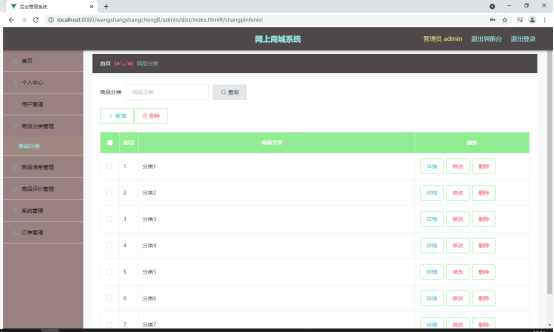 商品分类管理:管理员的功能有查看已发布的商品分类数据,修改商品分类,商品分类作废,即可删除。