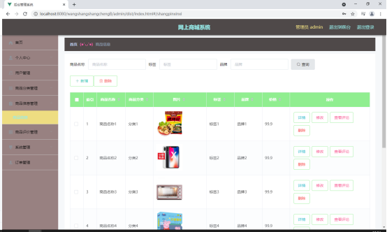 如图显示的就是商品信息管理页面,此页面提供给管理员的功能有:根据商品信息进行条件查询,还可以对商品信息进行新增、修改、查询操作等等。