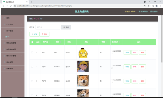 如图显示的就是用户信息管理页面,此页面提供给管理员的功能有:用户信息的查询管理,可以删除用户信息、修改用户信息、新增用户信息,还进行了对用户名称的模糊查询的条件。
