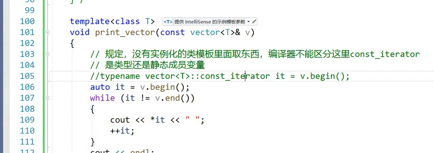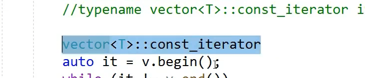 这种是实例化的,这种不敢取,到底是类型还是静态成员变量,不知道,要等实例化再取,但是又没有实力化,编译器报错了,所以这typename,,声明模版参数可以用typename 也可以class ,但是typename有不同,如果类模版取内嵌的东西,没有实例化的类模版里面取东西,编译器不能区分这里const_iterator是类型还是静态变量,这里加typename,编译器就知道这程序员确认了类型,合乎语法,想成编译器甩锅,编译器只会检查这块没实例化的初步的语法,