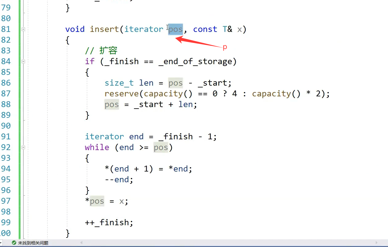 扩容之后pos还指向原来的空间,这种情况较迭代器失效,这种类似野指针,