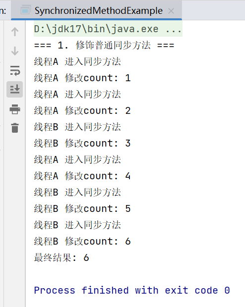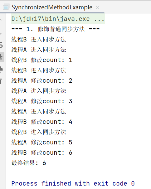 public class SynchronizedMethodExample {private int count = 0;// 修饰普通同步方法 - 锁的是当前实例对象public synchronized void increment() {System.out.println(Thread.currentThread().getName() + " 进入同步方法");try {Thread.sleep(1000); // 模拟耗时操作} catch (InterruptedException e) {e.printStackTrace();}count++;System.out.println(Thread.currentThread().getName() + " 修改count: " + count);}public int getCount() {return count;}public static void main(String[] args) throws InterruptedException {System.out.println("=== 1. 修饰普通同步方法 ===");SynchronizedMethodExample example = new SynchronizedMethodExample();// 创建多个线程操作同一个对象Thread t1 = new Thread(() -> {for (int i = 0; i < 3; i++) {example.increment();}}, "线程A");Thread t2 = new Thread(() -> {for (int i = 0; i < 3; i++) {example.increment();}}, "线程B");t1.start();t2.start();Thread.sleep(10000);//主线程先睡眠,防止主线程执行完了,子线程还没执行完System.out.println("最终结果: " + example.getCount()); // 应该是6}