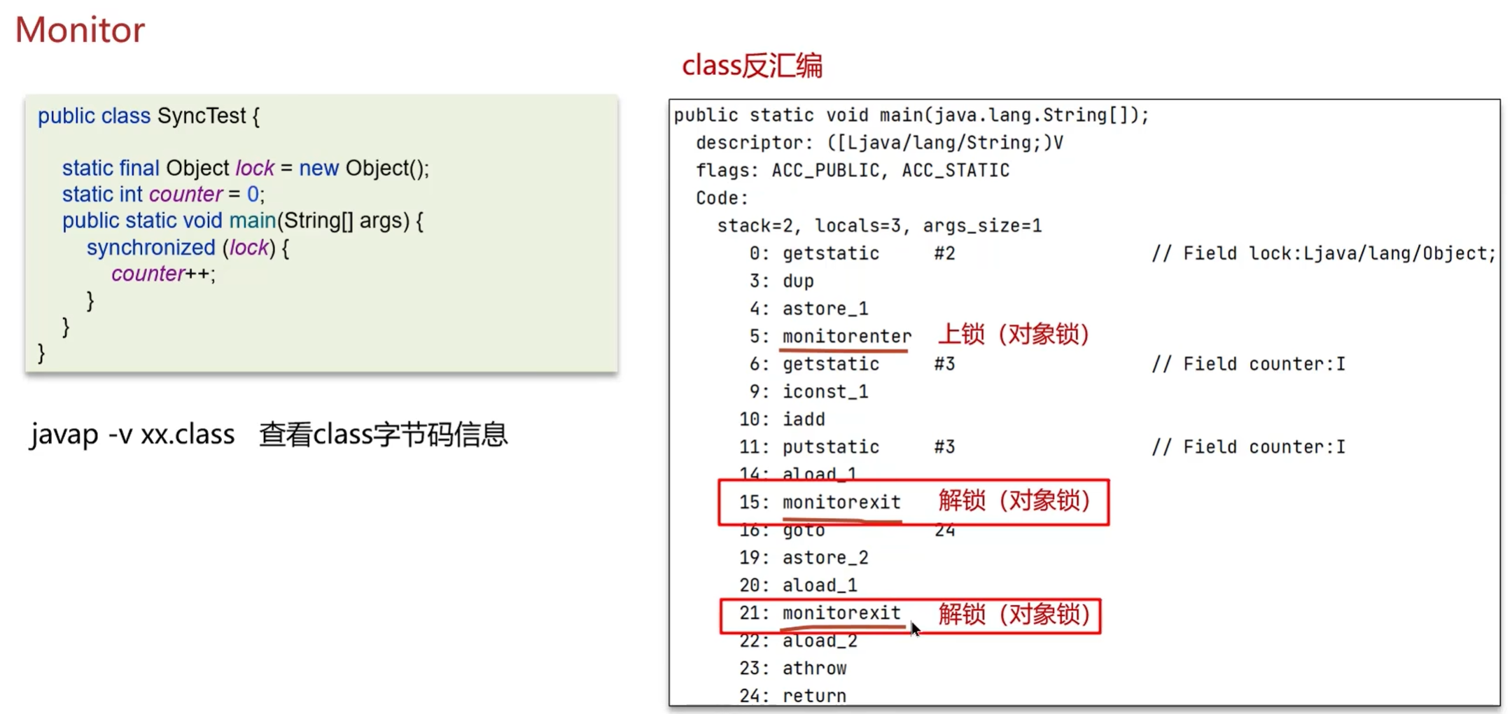 synchornized加锁和自动释放锁是基于moniter监视器实现,底层是c++实现,如下的代码片段,他就是上锁和释放锁的字节码反编译看到的,为什么释放两次呢,因为隐式实现try-catch-finally避免代码抛异常而没有释放锁,这就解释了上面的代码的moniterenter和moniterexit操作;