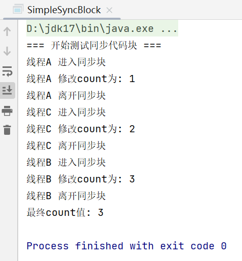 package 并发.Synchronized;public class SimpleSyncBlock {private int count = 0;private final Object lock = new Object(); // 自定义锁对象public void addCount() {// 同步代码块 - 使用自定义的lock对象作为锁synchronized (lock) {System.out.println(Thread.currentThread().getName() + " 进入同步块");// 模拟一些工作try {Thread.sleep(1000);} catch (InterruptedException e) {e.printStackTrace();}count++;System.out.println(Thread.currentThread().getName() + " 修改count为: " + count);System.out.println(Thread.currentThread().getName() + " 离开同步块");}}public static void main(String[] args) {SimpleSyncBlock example = new SimpleSyncBlock();// 创建3个线程同时调用addCount方法Thread t1 = new Thread(() -> example.addCount(), "线程A");Thread t2 = new Thread(() -> example.addCount(), "线程B");Thread t3 = new Thread(() -> example.addCount(), "线程C");System.out.println("=== 开始测试同步代码块 ===");t1.start();t2.start();t3.start();try {Thread.sleep(5000);//避免主线程都执行完了三个子线程还没执行完;} catch (InterruptedException e) {throw new RuntimeException(e);}System.out.println("最终count值: " + example.count);}