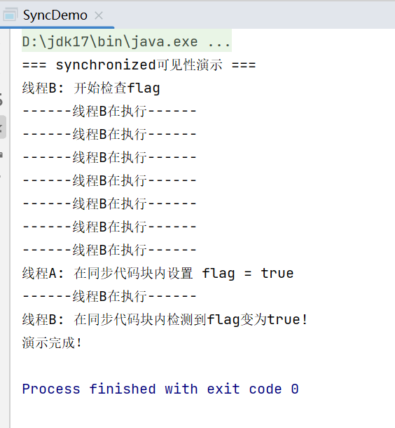 package 并发.Synchronized.特性;public class SyncDemo {private static boolean flag = false;private static final Object lock = new Object(); // 锁对象public static void main(String[] args) throws InterruptedException {System.out.println("=== synchronized可见性演示 ===");// 线程A:修改flag(使用同步代码块)Thread threadA = new Thread(() -> {try {Thread.sleep(1000);} catch (InterruptedException e) {e.printStackTrace();}// ✅ 同步代码块 - 锁对象是lock,获取到对象锁,就执行括号内的方法synchronized (lock) {flag = true;System.out.println("线程A: 在同步代码块内设置 flag = true");}});// 线程B:读取flag(使用同步代码块)Thread threadB = new Thread(() -> {System.out.println("线程B: 开始检查flag");while (true) {// ✅ 同步代码块 - 锁对象是lock,执行完一次就释放synchronized (lock) {System.out.println("------线程B在执行------");if (flag) {System.out.println("线程B: 在同步代码块内检测到flag变为true!");break;}}try {Thread.sleep(10);} catch (InterruptedException e) {e.printStackTrace();}}});threadB.start();threadA.start();threadA.join();threadB.join();System.out.println("演示完成!");}