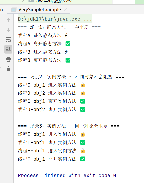 }public class VerySimpleExample {public static void main(String[] args) {SimpleCounter obj1 = new SimpleCounter();SimpleCounter obj2 = new SimpleCounter();System.out.println("=== 场景1:静态方法 - 会阻塞 ===");new Thread(() -> SimpleCounter.staticTask("线程A")).start();new Thread(() -> SimpleCounter.staticTask("线程B")).start();// 等上面执行完try { Thread.sleep(3000); } catch (Exception e) {}System.out.println("\n=== 场景2:实例方法 - 不同对象不会阻塞 ===");new Thread(() -> obj1.instanceTask("线程C-obj1")).start();new Thread(() -> obj2.instanceTask("线程D-obj2")).start();// 等上面执行完try { Thread.sleep(3000); } catch (Exception e) {}System.out.println("\n=== 场景3:实例方法 - 同一对象会阻塞 ===");new Thread(() -> obj1.instanceTask("线程E-obj1")).start();new Thread(() -> obj1.instanceTask("线程F-obj1")).start();}