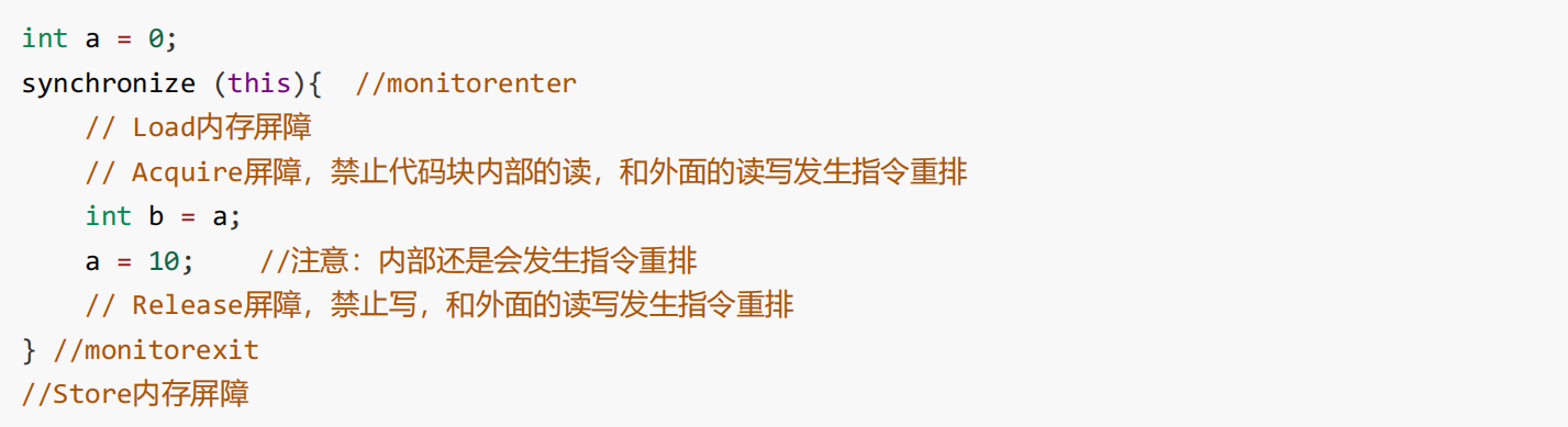 // Load内存屏障int b = a; //读,通过Load内存屏障,强制执行refresh,保证读到最新的a = 10; //写,释放锁时会通过Store,强制flush到高速缓存或主内存