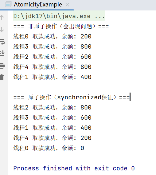 public class AtomicityExample {private int balance = 1000; // 账户余额// 没有同步 - 非原子操作public void withdrawUnsafe(int amount) {if (balance >= amount) {// 这里可能被其他线程打断,导致数据错误try {Thread.sleep(100); // 模拟处理时间} catch (InterruptedException e) {e.printStackTrace();}balance -= amount;System.out.println(Thread.currentThread().getName() + " 取款成功,余额: " + balance);} else {System.out.println("余额不足");}}// 使用synchronized保证原子性public synchronized void withdrawSafe(int amount) {if (balance >= amount) {try {Thread.sleep(100); // 模拟处理时间} catch (InterruptedException e) {e.printStackTrace();}balance -= amount;System.out.println(Thread.currentThread().getName() + " 取款成功,余额: " + balance);} else {System.out.println("余额不足");}}public static void main(String[] args) throws InterruptedException {AtomicityExample account = new AtomicityExample();System.out.println("=== 非原子操作(会出现问题)===");// 创建多个线程同时取款for (int i = 0; i < 5; i++) {new Thread(() -> account.withdrawUnsafe(200), "线程" + i).start();}Thread.sleep(2000);System.out.println("\n=== 原子操作(synchronized保证)===");account.balance = 1000; // 重置余额for (int i = 0; i < 5; i++) {new Thread(() -> account.withdrawSafe(200), "线程" + i).start();}}