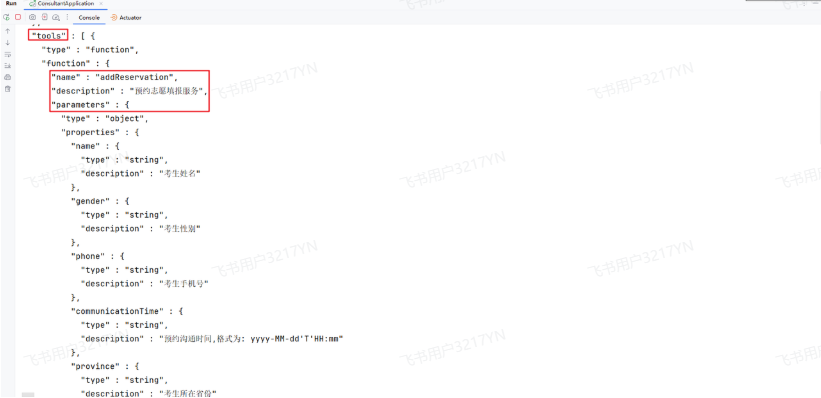public class ReservationTool {@Autowiredprivate ReservationService reservationService;//1.工具方法: 添加预约信息@Tool("预约志愿填报服务")public void addReservation(@P("考生姓名") String name,@P("考生性别") String gender,@P("考生手机号") String phone,@P("预约沟通时间,格式为: yyyy-MM-dd'T'HH:mm") String communicationTime,@P("考生所在省份") String province,@P("考生预估分数") Integer estimatedScore){Reservation reservation = new Reservation(null,name,gender,phone, LocalDateTime.parse(communicationTime),province,estimatedScore);reservationService.insert(reservation);}//2.工具方法: 查询预约信息@Tool("根据考生手机号查询预约单")public Reservation findReservation(@P("考生手机号") String phone){return reservationService.findByPhone(phone);}