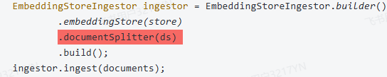 真正分割文本的操作被封装到EmbeddingStoreIngestor中了,所以我们需要在构建该对象的时候,通过documentSplitter方法告诉它将来使用哪个文本分割器。