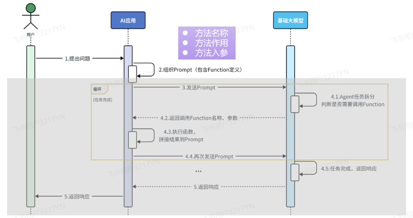 这里需要注意的是由于在一次任务的处理过程中可能需要根据顺序调用多个函数,所以当大模型接收到AI应用发送的数据继续拆解任务,如果发现还需要调用其他的函数,则会重复4.1~4.4这几个步骤,直到无需调用函数,最终把生成的结果响应该AI应用,并由AI应用发送给用户。