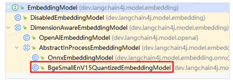 LangChain4j中提供了EmbeddingModel接口用于定义有关向量模型的方法,例如有embed、embedall等等方法用于把文本片段向量化。LangChain4j提供了一个内存版本的向量模型实现方案,而咱们快速入门中使用的就是这个向量模型,只是咱们当时并没有指定这个向量模型,因为它被封装到EmbeddingStoreIngestor中了,所以我们并没有看到。