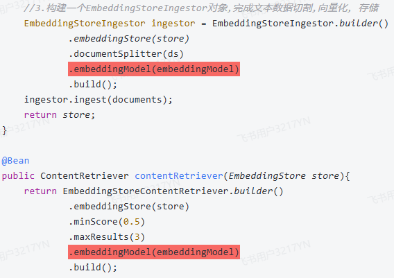 当我们配置完毕后,LangChain4j会自动的根据我们的配置信息往IOC容器中注入一个EmbeddingModel对象供我们使用,所以接下来我们只需要把这个EmbeddingModel对象交给EmbeddingStoreIngestor和EmbeddingStoreContentRetriever即可,一个是存储的时候使用,一个是检索的时候使用。