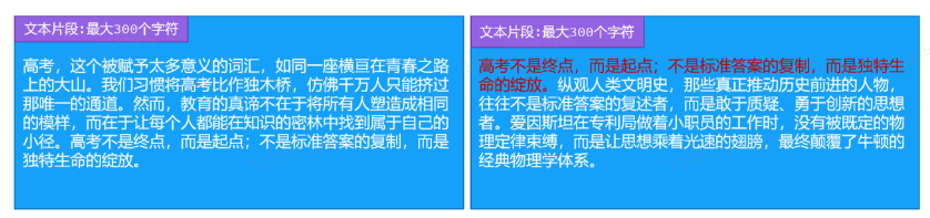 我们解决的办法就是让两个片段存储的内容有重叠的部分,上一个片段的末尾与下一个片段的开头重复,这样就可以保持语义的连贯性了。比如我把高考不是重点, 而是起点...这句话存储到第二个片段的开头就能解决这个问题,咱们第二个参数就是用于指定重叠部分字符的数量。