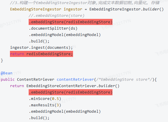 和之前一样,将IOC容器中的RedisEmbeddingStore对象分别设置给EmbeddingStoreIngestor和EmbeddingStoreContentRetriever,用于存储和检索。