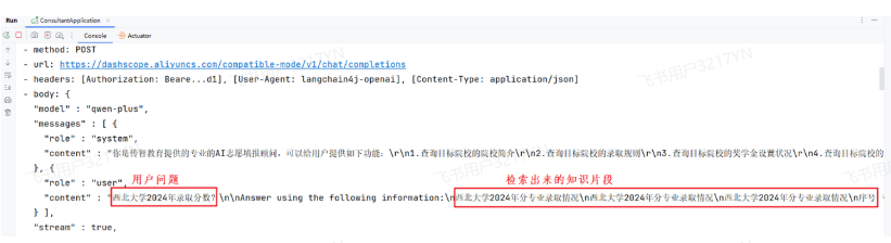 功能已经实现完毕了,测试的时候注意观察IDEA控制台的信息,langchain4j给大模型发送消息的时候会使用tools参数告诉大模型,有哪些函数可以调用。