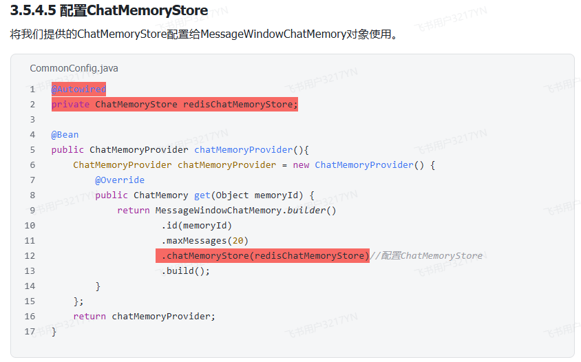 public ChatMemoryProvider chatMemoryProvider() {ChatMemoryProvider chatMemoryProvider = new ChatMemoryProvider() {@Overridepublic ChatMemory get(Object memoryId) {return MessageWindowChatMemory.builder().id(memoryId)//id值.maxMessages(20)//最大会话记录数量.build();}};return chatMemoryProvider;