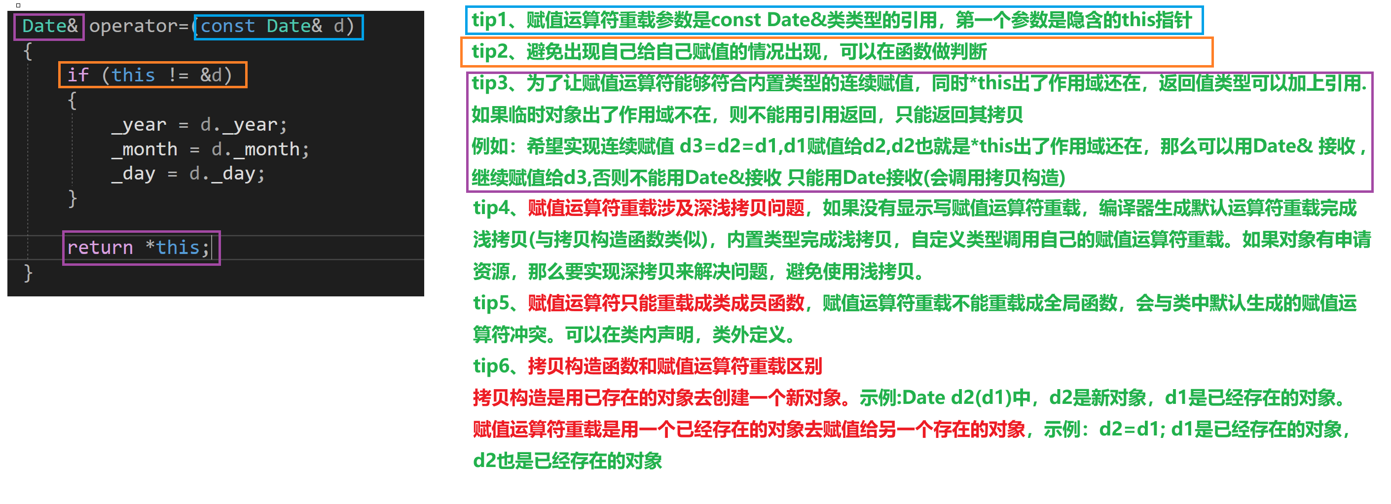 tip5、赋值运算符只能重载成类成员函数,赋值运算符重载不能重载成全局函数,会与类中默认生成的赋值运算符冲突。可以在类内声明,类外定义。