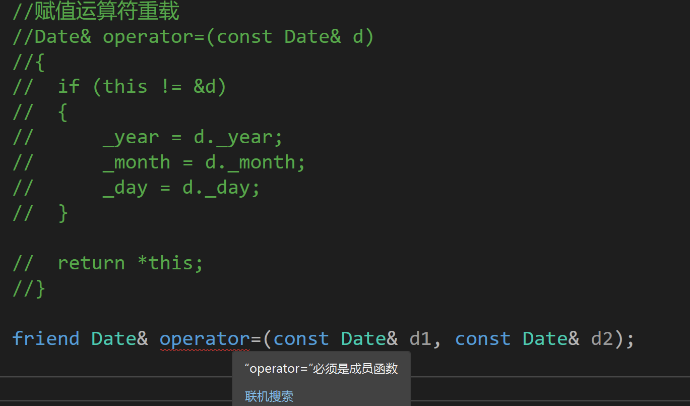public://全缺省构造函数Date(int year = 2025, int month = 11, int day = 15){_year = year;_month = month;_day = day;}//赋值运算符重载//类内声明Date& operator=(const Date& d);//friend Date& operator=(const Date& d1, const Date& d2);//errorprivate:int _year;int _month;int _day;