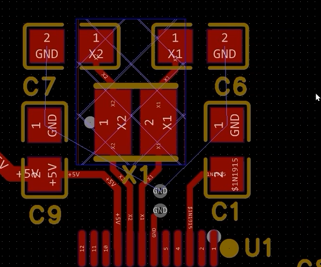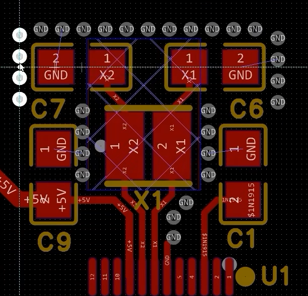 2、每隔50mil的距离打一个GND过孔,将晶振包含进去