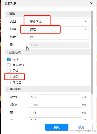 顶层和底层都得禁止铺铜。元件不用勾选!