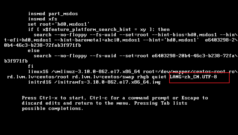 按e 进入编辑,在末尾添加 LANG=zh_CN.UTF-8 后面,添加init=/bin/sh