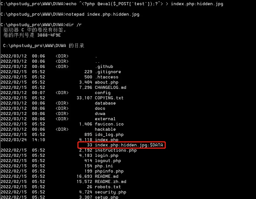 notepad index.php:hidden.jpg - 查看文件关联的隐藏数据流(仅列出是否存在该隐藏流,不直接显示内容):