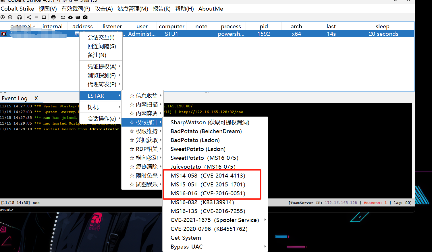 我们如果已经使用CS连接到了肉鸡,我们可以使用插件来提权
