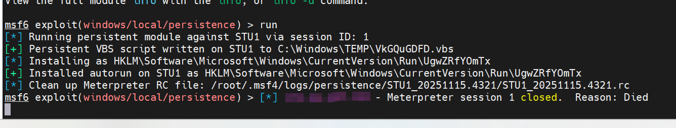 好了,我们已经进去且权限提高了,这个时候我们已经可以做大部分事情的时候,结果连接突然断开,那就很无语了。所以我们现在整如何保持住权限且不被发现。