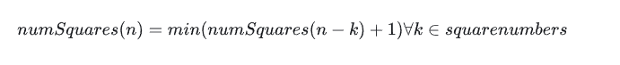 class Solution(object):def numSquares(self, n):square_nums = [i**2 for i in range(1, int(math.sqrt(n))+1)]def minNumSquares(k):""" recursive solution """# bottom cases: find a square numberif k in square_nums:return 1min_num = float('inf')# Find the minimal value among all possible solutionsfor square in square_nums:if k < square:breaknew_num = minNumSquares(k-square) + 1min_num = min(min_num, new_num)return min_numreturn minNumSquares(n)上面的解决方案可以适用于较小的正整数 n。然而,会发现对于中等大小的数字(例如 55),我们也会很快遇到超出时间限制的问题。