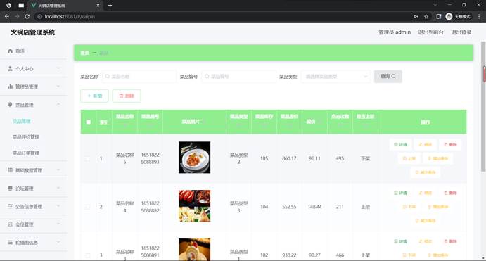 如图5.2显示的就是菜品信息管理页面,此页面提供给管理员的功能有:查看已发布的菜品信息数据,修改菜品信息,菜品信息作废,即可删除,还进行了对菜品信息名称的模糊查询 菜品信息信息的类型查询等等一些条件。