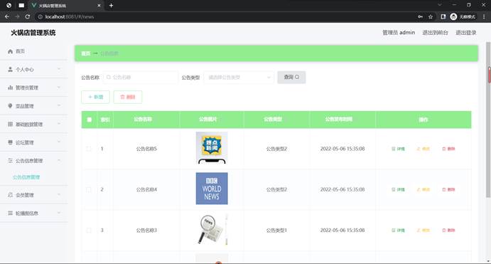 如图5.4显示的就是公告信息管理页面,此页面提供给管理员的功能有:根据公告信息进行新增、修改、查询操作等等。