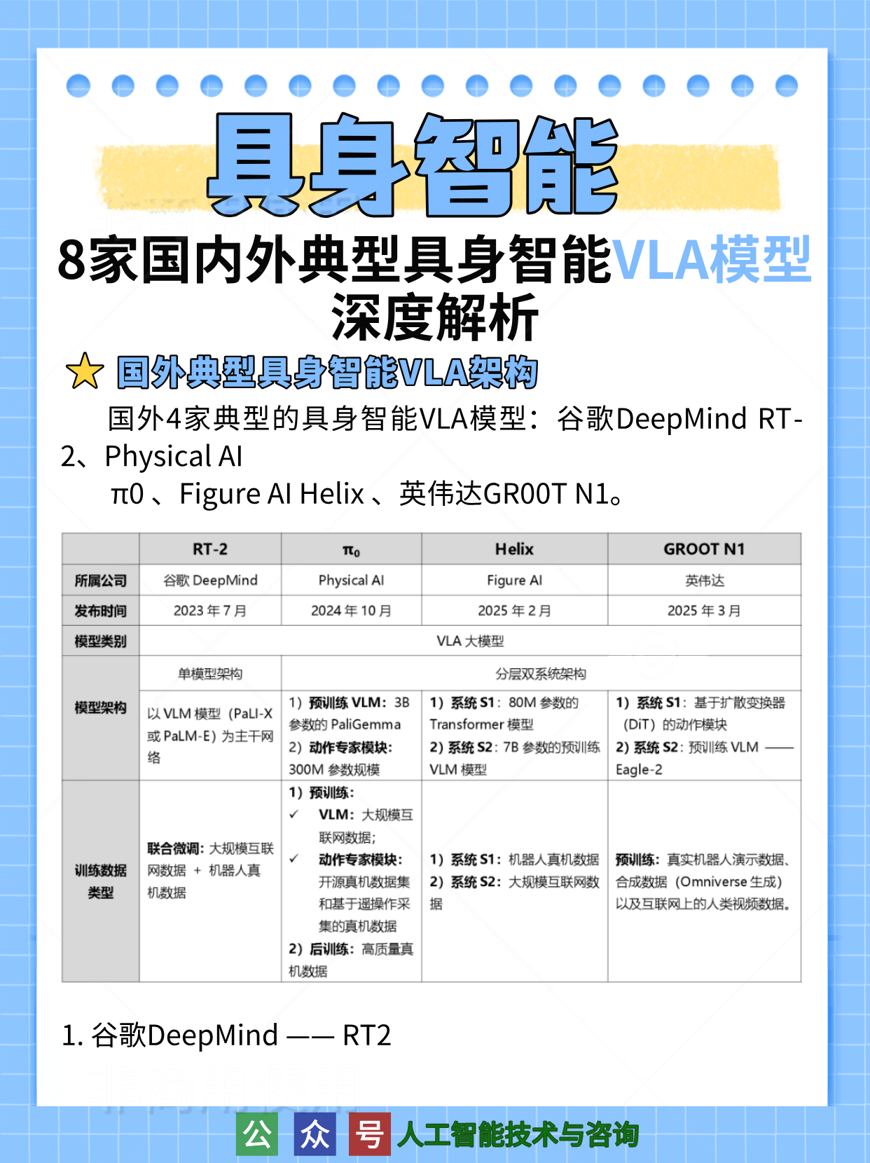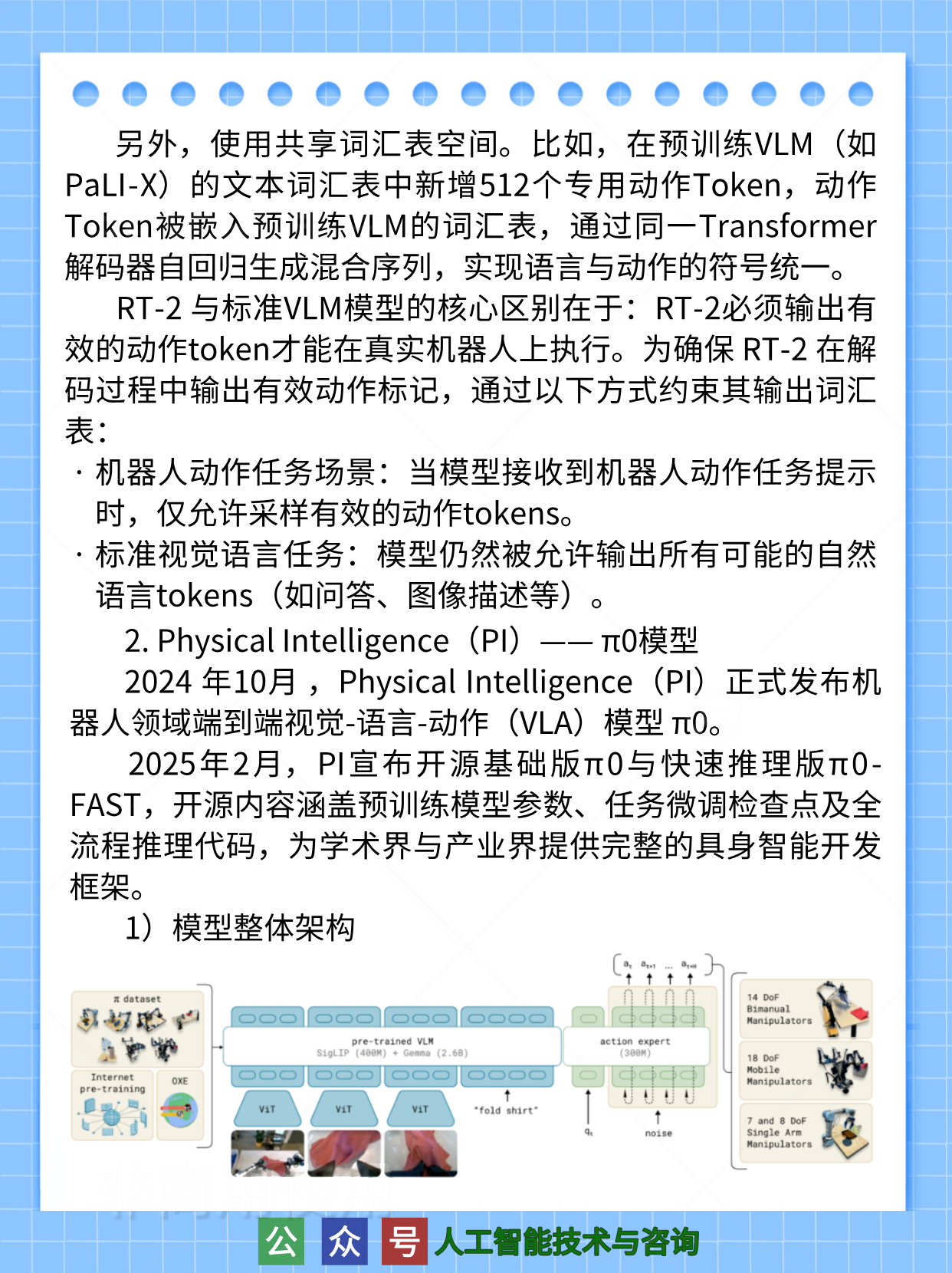 国外典型具身智能VLA架构1.谷歌DeepMind —— RT21)模型架构2)联合微调(Co-Fine-Tune)3)动作Token化机制2. Physical Intelligence(PI)—— π0模型1)模型整体架构人工智能/具身智能/VLA/大模型