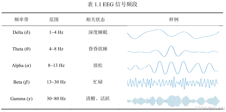 通过傅立叶变换将时域信号转换到频域,可以将其分解成几个与人类神经活动密切相关的子带,如 δ(1-4hz)、θ(4-8hz)、α(8-13hz) 、β(13-30hz)和 γ(30-80 Hz)频段。δ、θ、α、β 和 γ 频段分别与深度睡眠、昏昏欲睡、放松、忙碌、清醒和活跃状态相关。表 1.1 给出了 EEG 信号不同频段的样例。随着认知负荷难度的增加,α 频段功率减小和 θ 频段功率增大等变化可以作为认知负荷识别的指标。