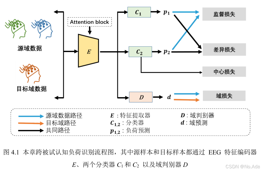 - 源域数据(比如被试 A 的 EEG)和目标域数据(比如被试 B 的 EEG),都输入到同一个特征提取器 E中;