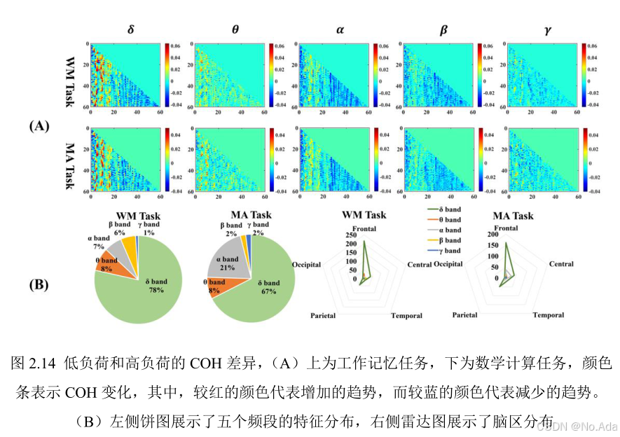 颜色条表示COH 变化,颜色越深表明差异越大。可以发现,两个任务的 COH 差异性分布模式相似,其中额叶区域的 δ 频段 COH 值有增加的趋势,而中央和枕叶区域的和