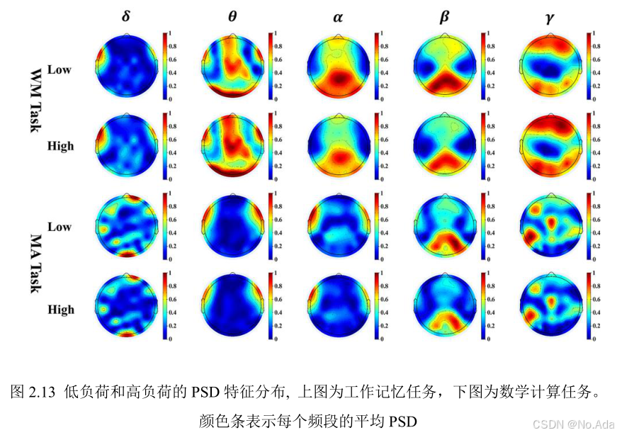 在这里,整个大脑区域被分为额叶、中央、枕叶、顶叶和颞叶。可以发现同一任务中的 PSD 分布具有相似的模式,但在两个认知任务之间有所不同。