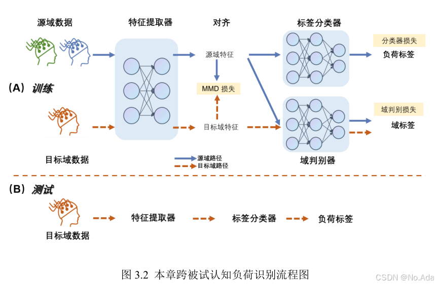 - 训练时通过 “分类损失”(比如交叉熵)约束:让标签分类器能准确区分不同源域的负荷类别,保证特征的类别判别性(不管是哪个被试的特征,都能正确识别负荷)。