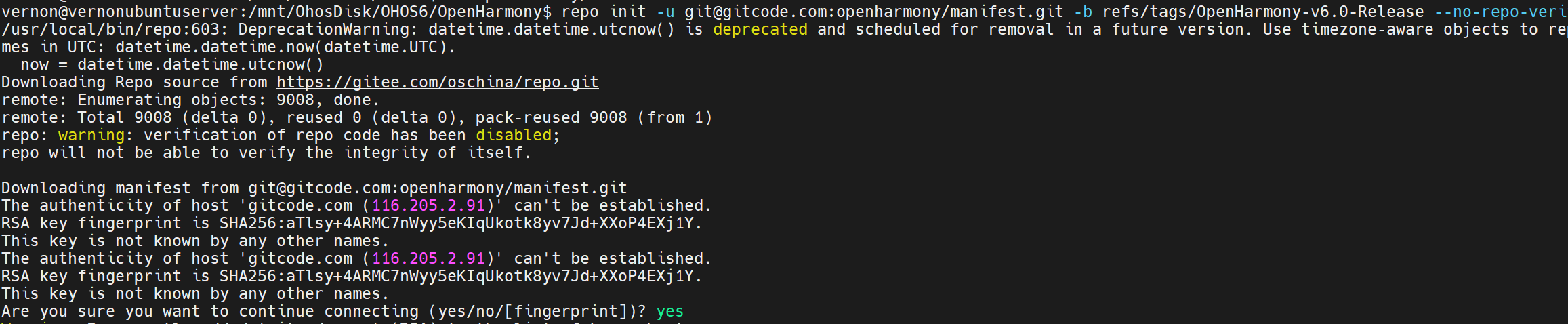 并且,创建如下的目录层级:[Home/OHOS6/OpenHarmony],在OpenHarmony文件夹中执行repo的init,用repo拉取源码