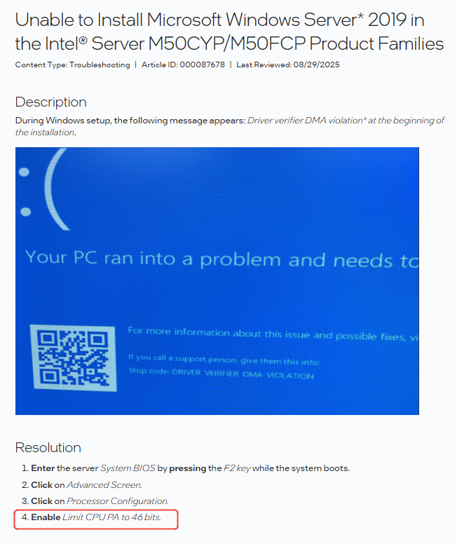 【故障排查】intel 服务器安装Win server 2019蓝屏解决方法