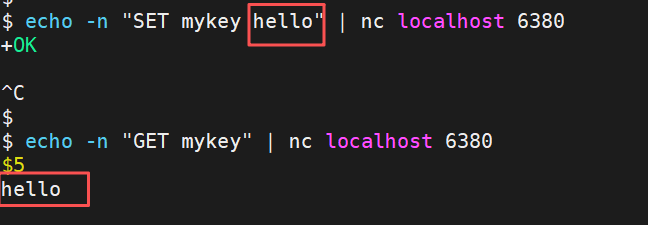 echo -n "SET mykey hello" | nc localhost 6380# 获取键值