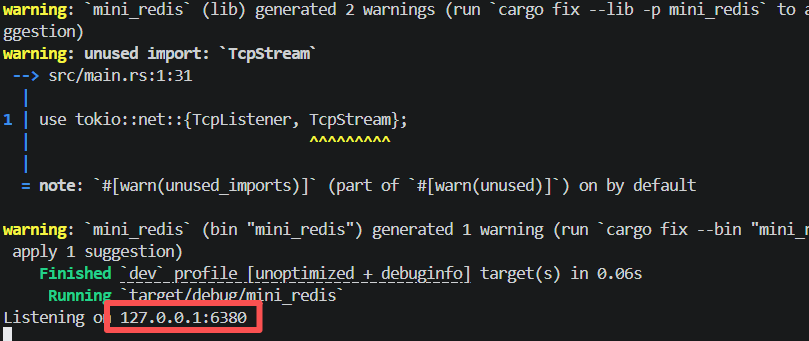 async fn main() -> Result<(), Box<dyn std::error::Error>> {let listener = TcpListener::bind("127.0.0.1:6380").await?;println!("Listening on 127.0.0.1:6380");loop {let (mut socket, _) = listener.accept().await?;tokio::spawn(async move {let mut server = mini_redis::Server::new();if let Err(e) = server.process(&mut socket).await {println!("Error: {}", e);}});}