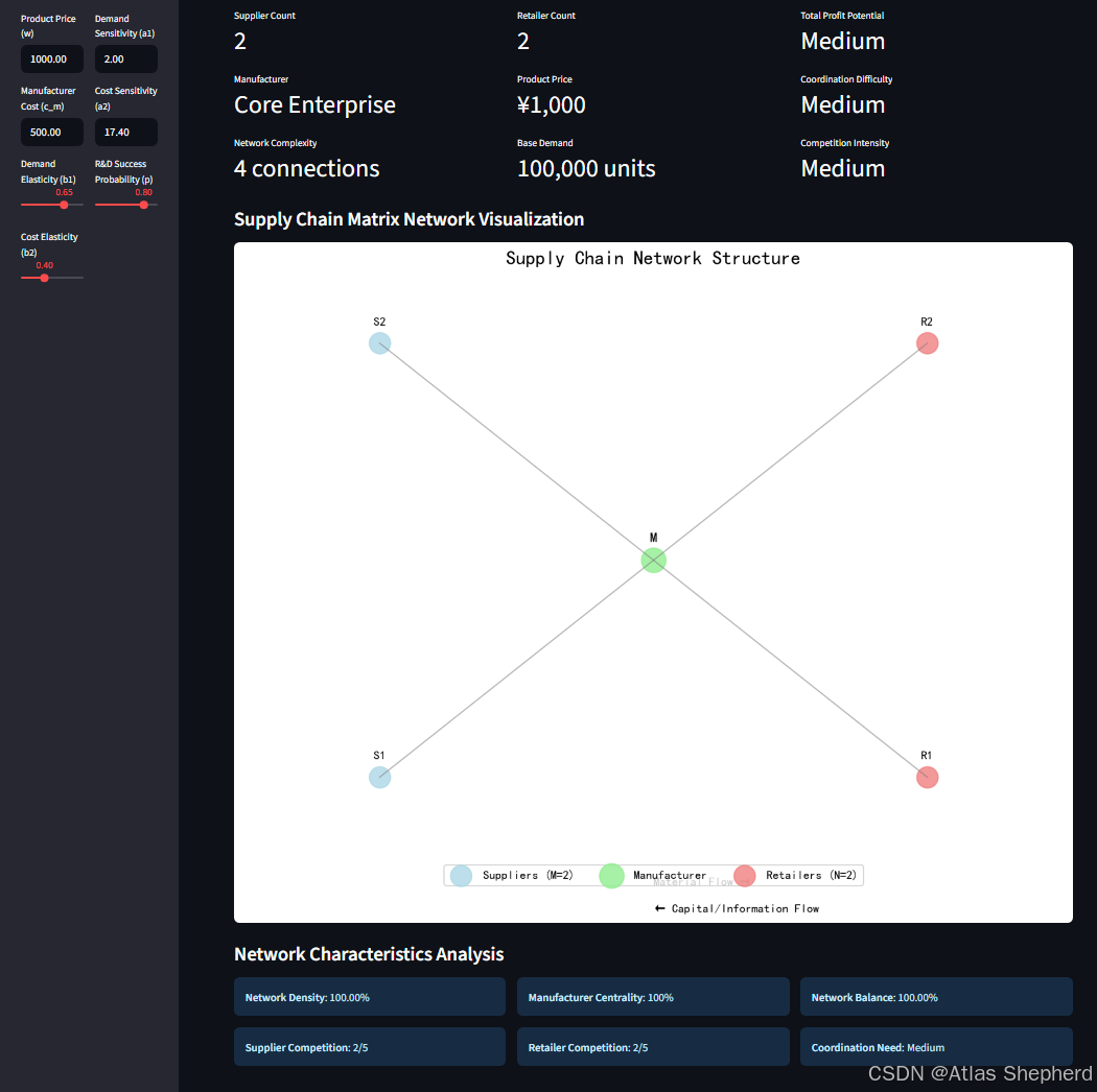 class SupplyChainGame:# 核心经济参数self.w = 1000 # 产品售价self.c_m = 500 # 制造成本self.D_bar = 100000 # 基准需求数学模型