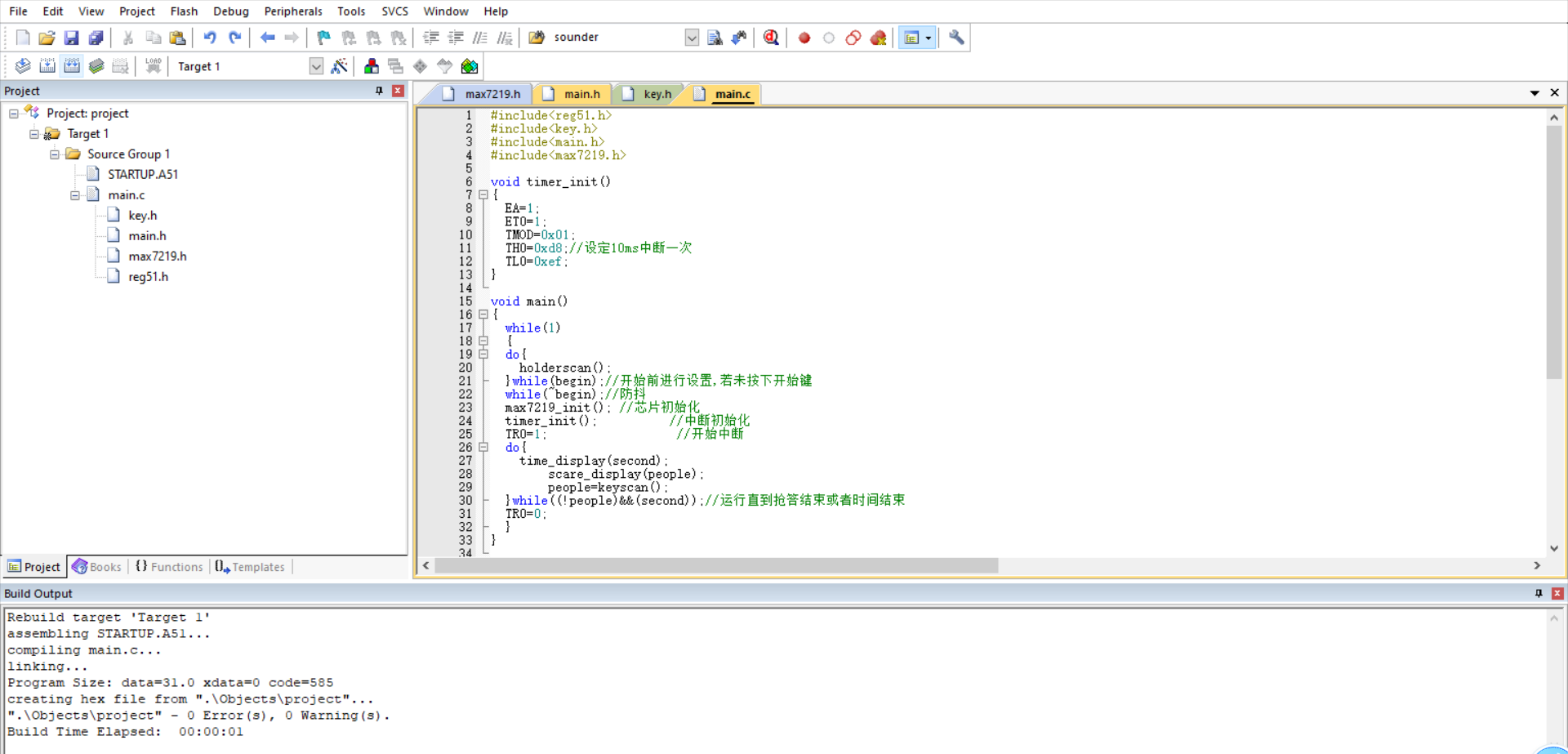 {while(1){do{holderscan();}while(begin);//开始前进行设置,若未按下开始键while(~begin);//防抖max7219_init(); //芯片初始化timer_init(); //中断初始化TR0=1; //开始中断do{time_display(second);scare_display(people);people=keyscan();}while((!people)&&(second));//运行直到抢答结束或者时间结束TR0=0;}