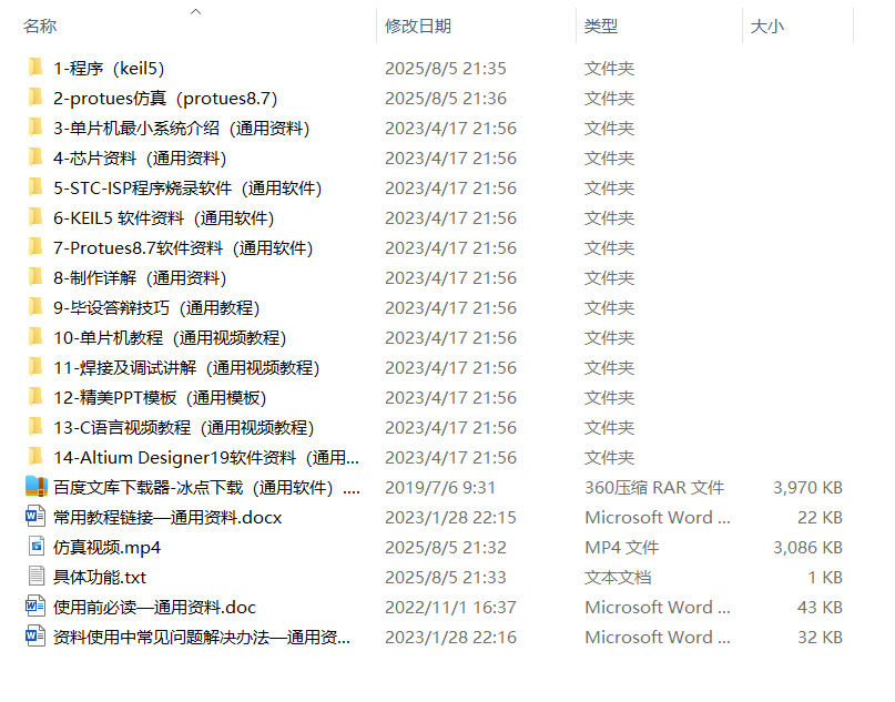 全部资料包括程序(keil5)、protues仿真(protues8.7)、设计说明、软硬件设计框图、答辩PPT、开发资料、资料使用介绍、仿真视频、程序讲解视频、仿真讲解视频、最小系统介绍视频等。