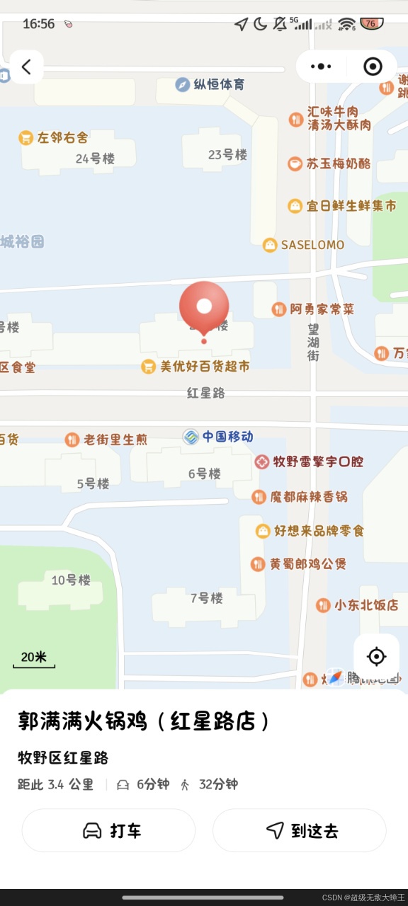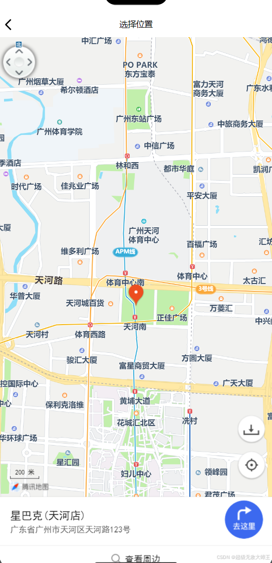 });当你调用这个小程序的API时, 就会出现这样一个地图画面(微信开发者工具上的效果), 通过点击去这里就可以调用手机上的地图APP了, 这样就可以实现实时导航,良好的用户体验。